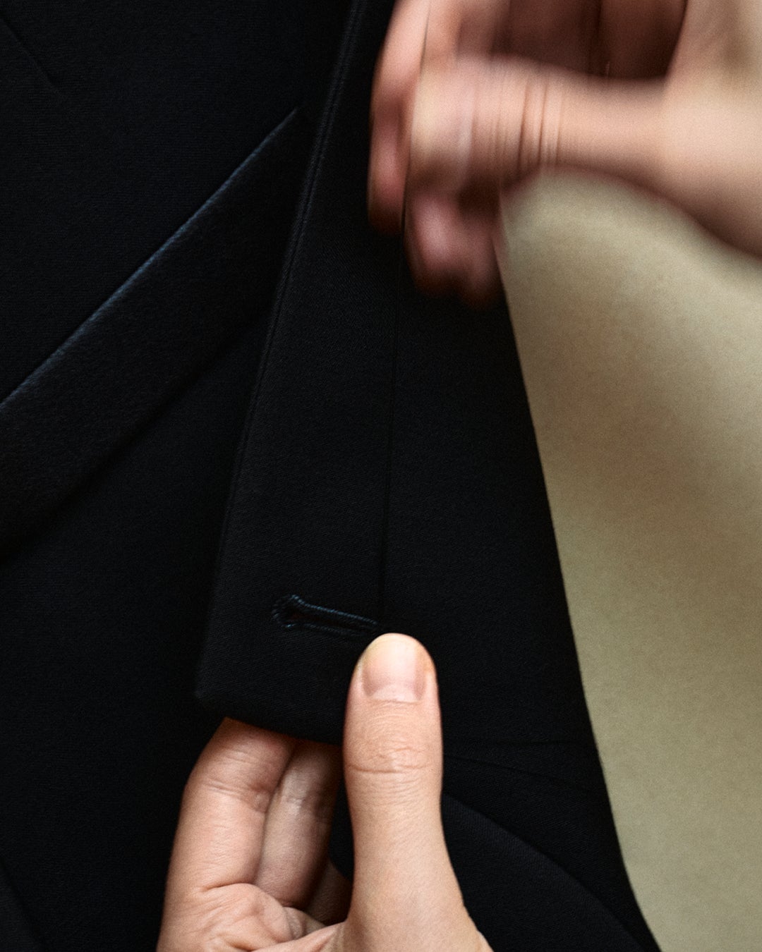 サイドに洗練されたサテンストライプを施したストレートのタキシードパンツと合わせて、コーディネートを完成させました。