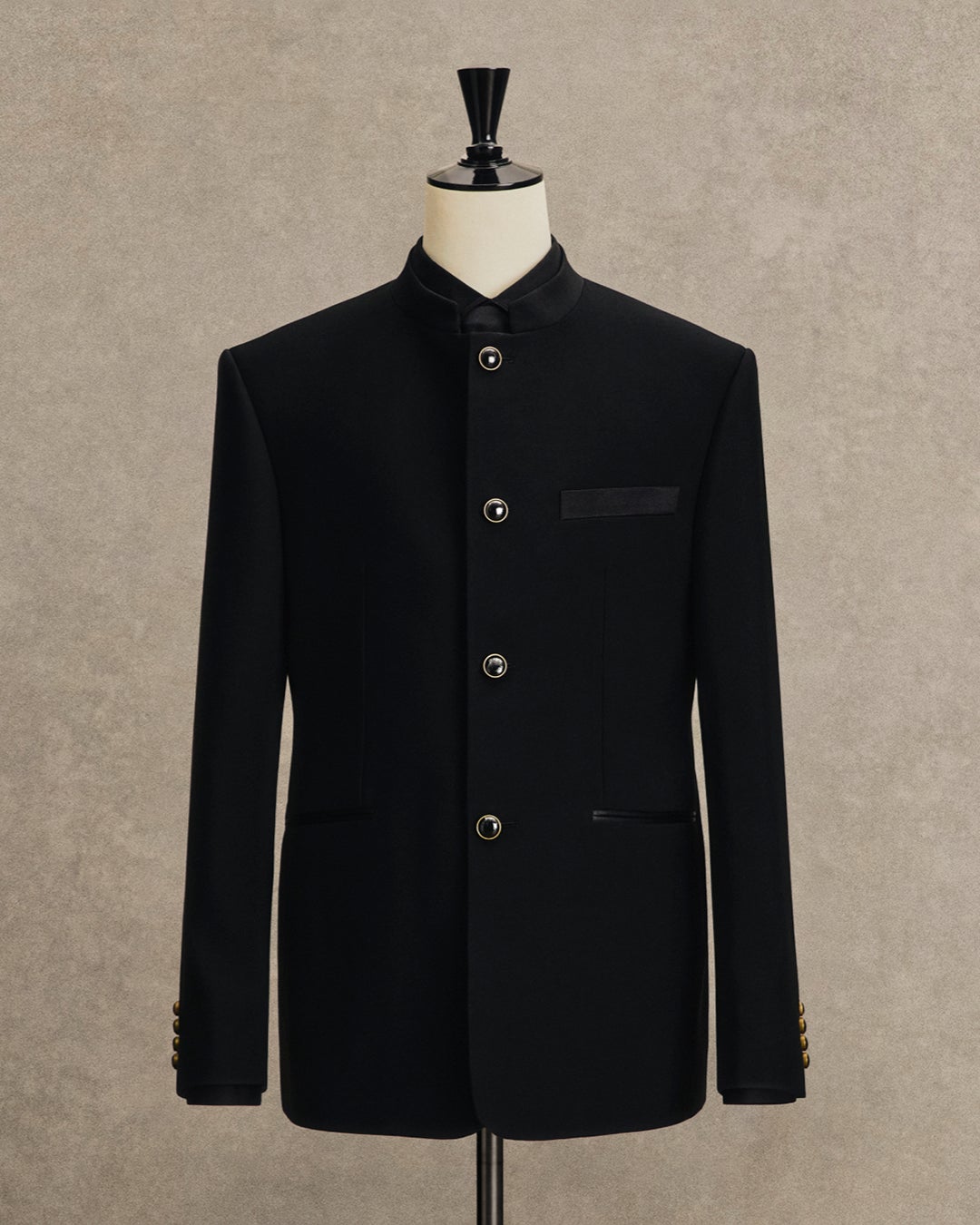 マイケル·B·ジョーダンが着用したブラックのオフィサーカラージャケットは、100%ウールで仕立てられ、エレガントなシルクサテンの胸ポケットとパイピングのディテールが特徴。また、ブラックとゴールドのロゴ入りボタンで装飾されています。
