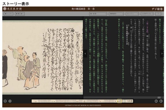 絵巻物鑑賞の醍醐味は、物語を読み進めながら、それが絵画ではどのように描き表されているかを楽しむことにあります。「デジ絵巻」では、書かれた物語(「詞書(ことばがき)」)と描かれた絵画とをスクロールしながら見るだけではなく、くずし字や歴史的仮名遣いで書かれた「詞書」を現代語表記に置き換えた「翻字(ほんじ)」を上から透かして重ねたり2画面で並べて表示したりすることも可能で、あらすじと場面解説を記載した「ストーリー」を別途表示させながら見ることもできます。拡大して細部を確認したり、「ストーリー」に対応した絵画の場面を開いたりなど、Webサイトならではの楽しみ方も自在で大変好評をいただいております。さらに今回は詠まれた俳句から絵画の場面を開く機能も加えました。