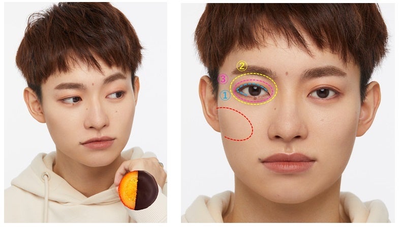 【メイクポイント】ミルクチョコカラーのアイラインにオレンジアイシャドウを重ねグラデーションに