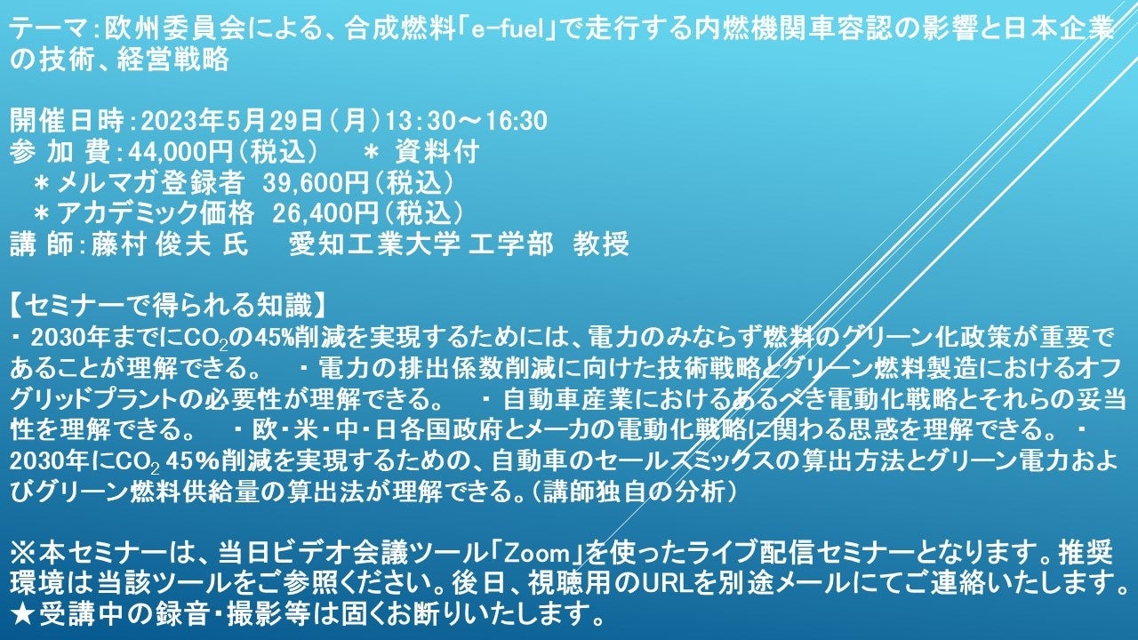 【ライブ配信セミナー】欧州委員会による、合成燃料「e-fuel」で走行する内燃機関車容認の影響と日本企業の技術、経営戦略 5月29日(月)開催 主催:(株)シーエムシー・リサーチ