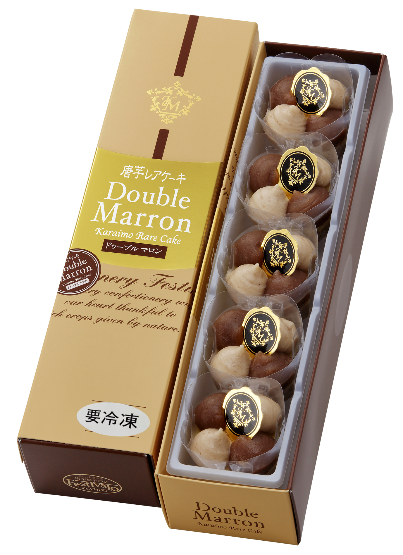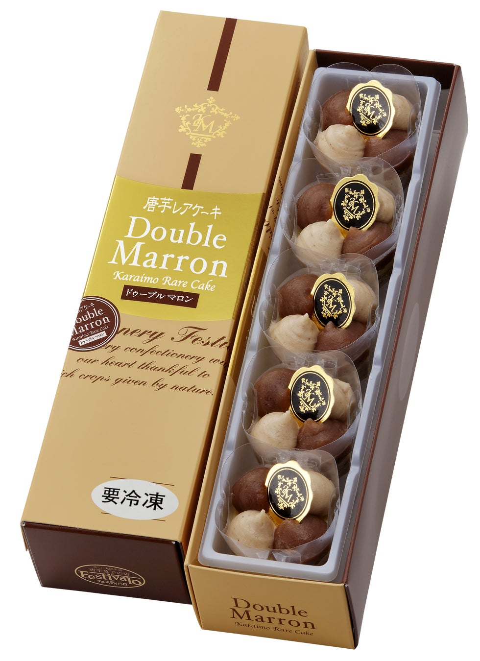 特製マロンガナッシュに唐芋レアケーキ「ラブリー」を重ね、2種類のマロンクリームをトッピングしました。
