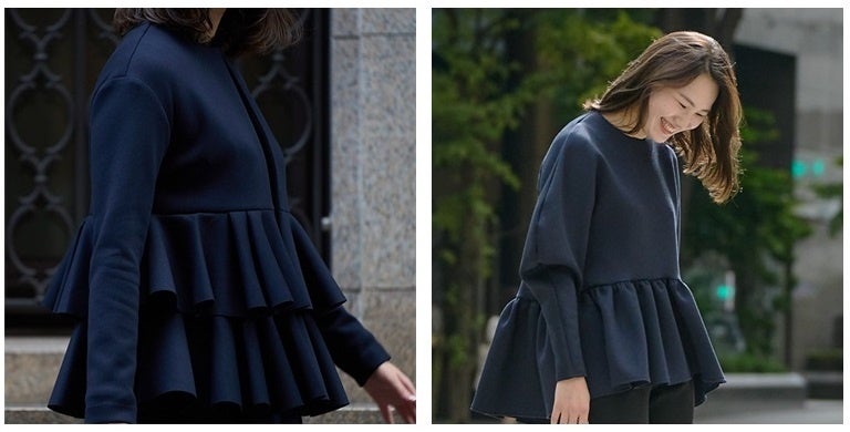 <TSURU By Mariko Oikawa>左:ジャケット 34,100円/右:ブラウス 20,900円(ともにホワイト・ブラック・ネイビー/ポリエステル80%・レーヨン15%・ポリウレタン5%/フリーサイズ(Mサイズ相当))