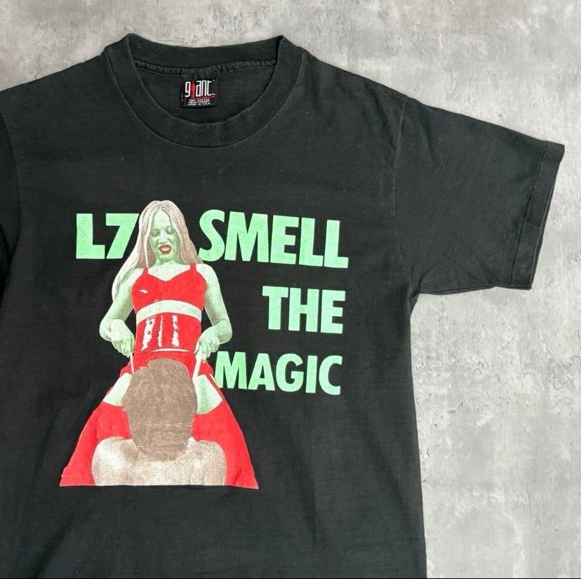 80年代を代表するガールズバンドL7 の2ndアルバムのSMELL THE MAGICのジャケデザインのTシャツ。