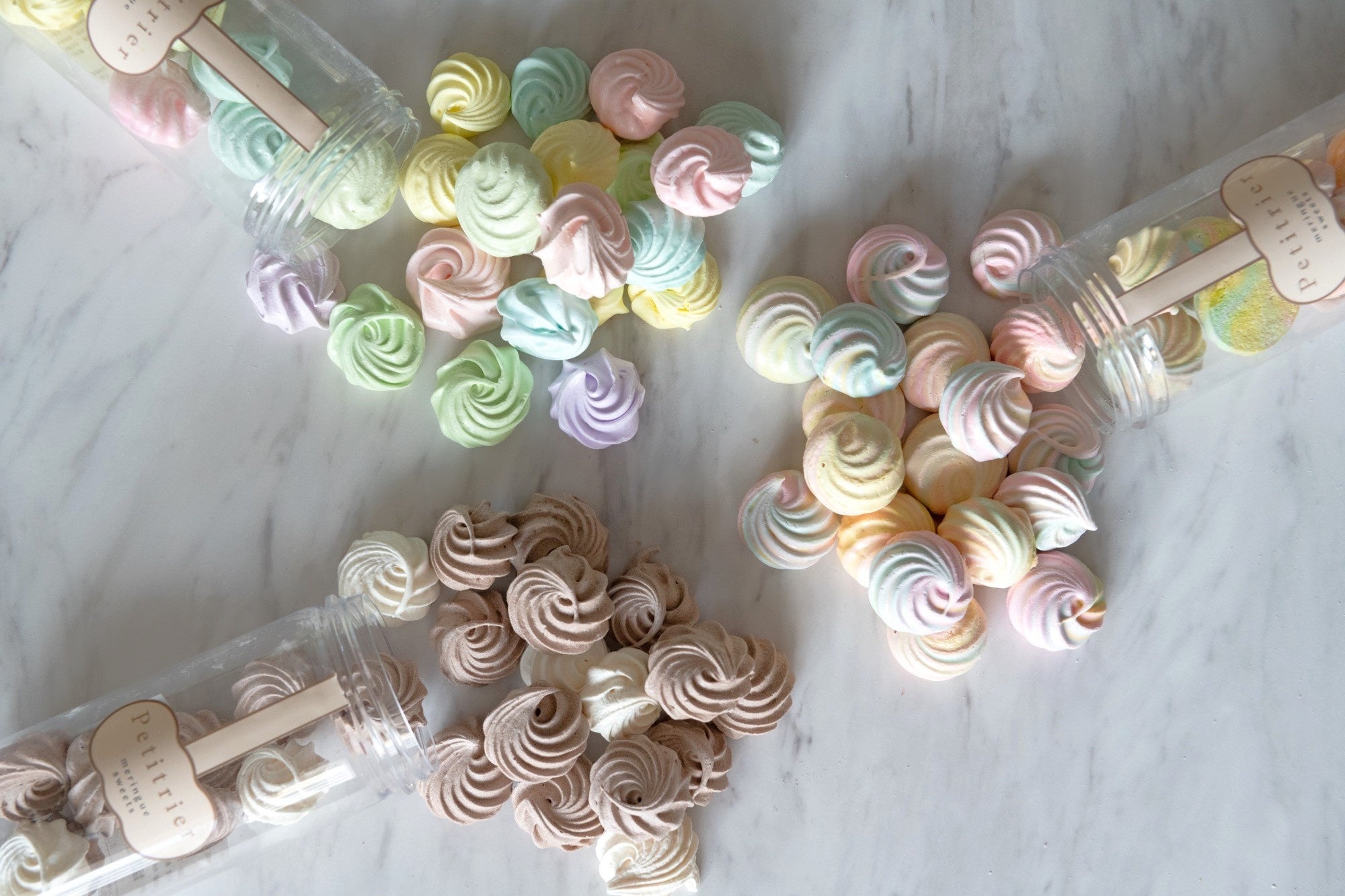 メレンゲとは、卵白に砂糖を入れて泡立てたもの。この泡立てる過程で、卵白に含まれるタンパク質が変性し、空気を含むことでボリュームが増し、お菓子に軽やかな食感をもたらします。卵白に砂糖を加えるタイミングによりメレンゲの質感を変えることが出来るので、レシピによってメレンゲを使い分けることで、お菓子をより美味しく美しいものへと仕上げることができます。そんなお菓子の名引き立て役にスポットを当て、メレンゲを主役にしたスイーツブランドが<Petitrier(プティリエ)>です。