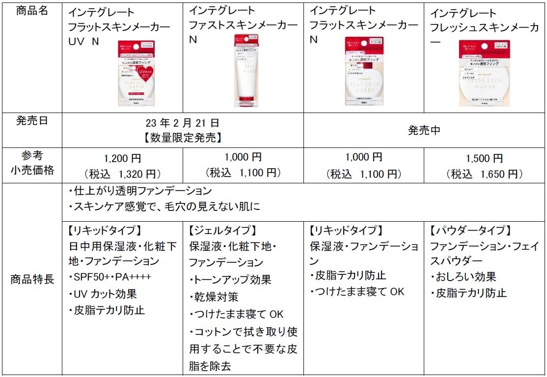 株式会社資生堂と株式会社マツキヨココカラ&カンパニーは、「まいにちにLovelyを」をコンセプトに展開する、資生堂のメイクアップブランド「インテグレート」の仕上がり透明ファンデーションシリーズから、「インテグレート フラットスキンメーカー UV N」参考小売価格1,200円(税込1,320円)*、「ファストスキンメーカー N」参考小売価格1,000円(税込1,100円)*【全2品】を共同企画し、2023年2月21日(火)に全国のマツモトキヨシグループ、ココカラファイングループ(一部店舗を除く)で数量限定発売します。