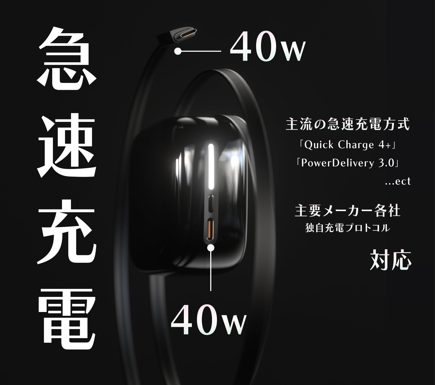 ケーブルと本体のポートの両方で、それぞれ最大40Wのフルパワー急速充電に対応!
