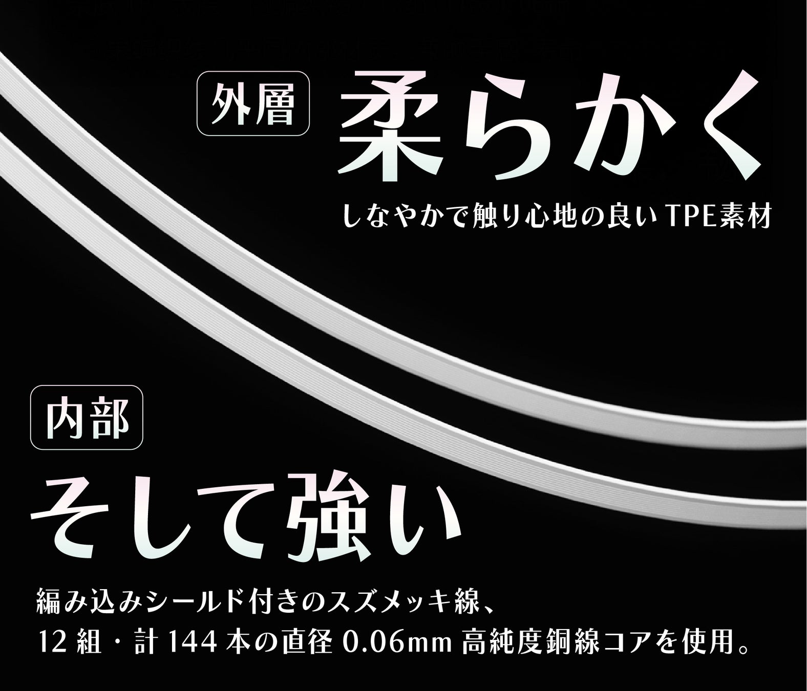 外層にはしなやかで触り心地の良いTPE素材を採用し、内部には編み込みシールド付きのスズメッキ線、さらに12組・計144本の直径0.06mm高純度銅線コアを使用。