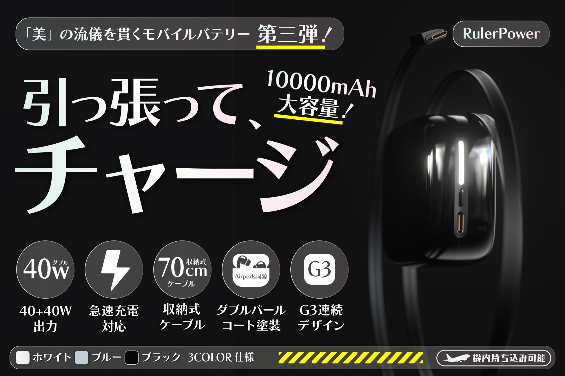 【最大30%オフ】【日本初上陸】USB-Cケーブルを持ち忘れる心配なし!手のひらサイズのケーブル収納式40Wハイパワーモバイルバッテリー「RulerPower」をクラウドファンディング開始!