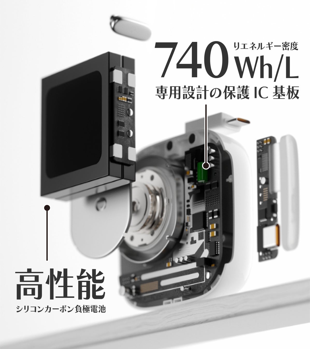 専用設計の保護IC基板によりエネルギー密度は驚異の740Wh/Lを実現。