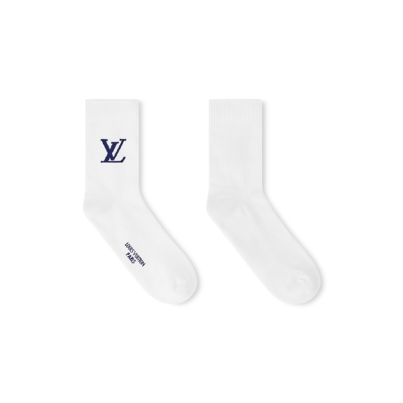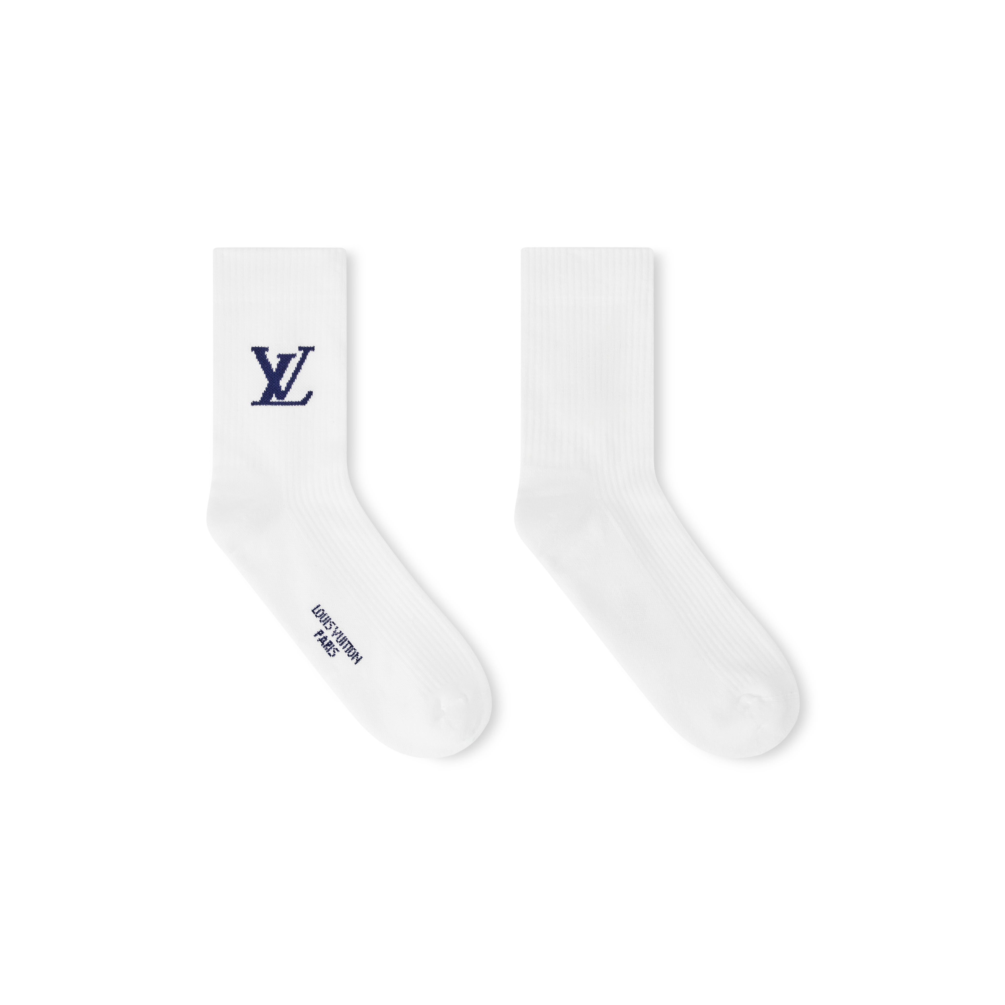 スポーティな定番アイテムに、シンプルなエレガンスを添える「ソックス·オンリー LV」。ホワイトのコットン混紡素材をベースに、足首の上には深みのあるブルーでLV イニシャルが編み模様としてあしらわれています。足裏の下部には「LOUIS VUITTON PARIS」のシグネチャーをさりげなく施し、履く方に特別な喜びをもたらします。