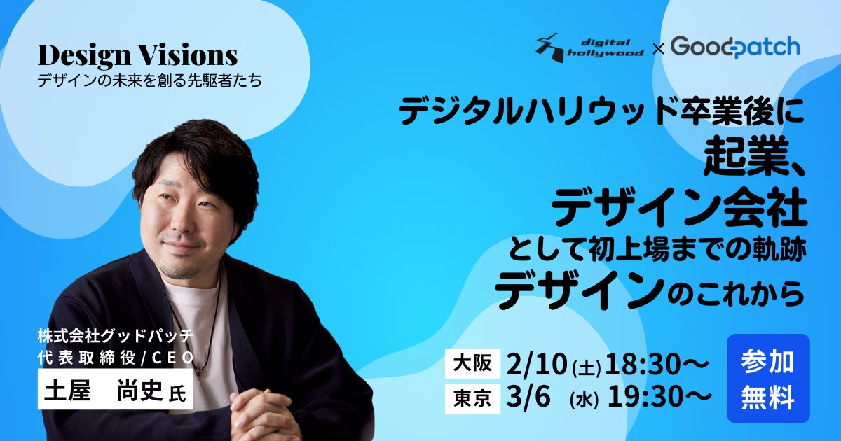 記念すべき第一回は、本スクール卒業生でもあり2020年にデザイン会社として初めて東京証券取引所に株式上場をされた株式会社グッドパッチの代表取締役社長/CEO土屋尚史氏が登壇。デジタルハリウッドでの学び、UI/UX分野の重要性・スキル、仕事の現場でのご自身の価値観、デザイン業界の未来や企業が求める人材像についてお話しいただきます。