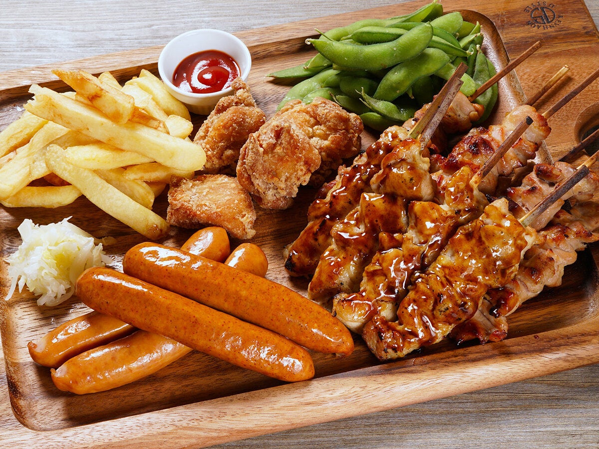 (チキンの唐揚げ・ソーセージ2種盛合せ・焼き鳥(10本)・フライドポテト・枝豆)