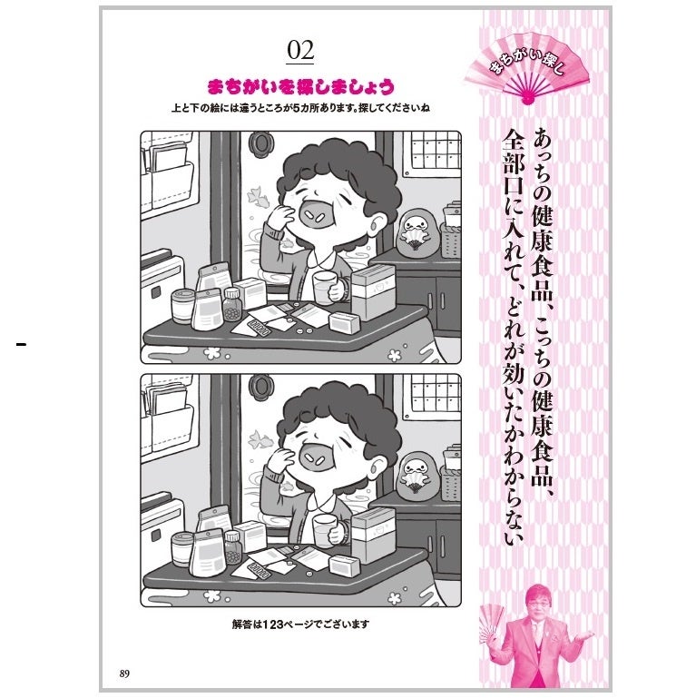 そんなネタの数々を、まちがい探しや迷路、クロスワードパズルや点つなぎなど、人気の定番脳トレに変換!