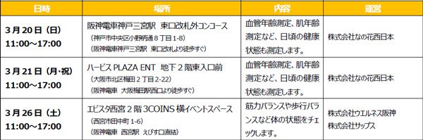 沿線3か所(大阪梅田、西宮、神戸三宮のオープンスペース ※下表参照)で血管年齢測定、肌年齢測定、筋力バランスなどを実施します。参加は無料、事前予約も不要です。
