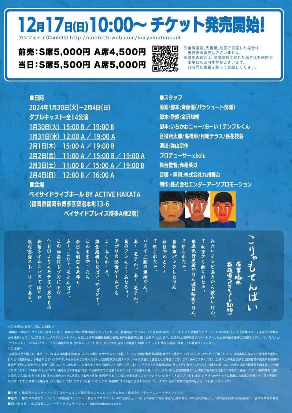 2023年夏、NHK総合でドラマ化!斉藤優(パラシュート部隊)が原案・脚本を手がける人気舞台「こりゃもてんばい」第4弾が上演決定!
