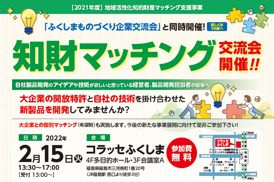 【福島県内企業向け】 富士通㈱・キユーピー㈱の知財で新製品開発につなげよう!2/15(火)「知財マッチング交流会」をオンラインで開催!