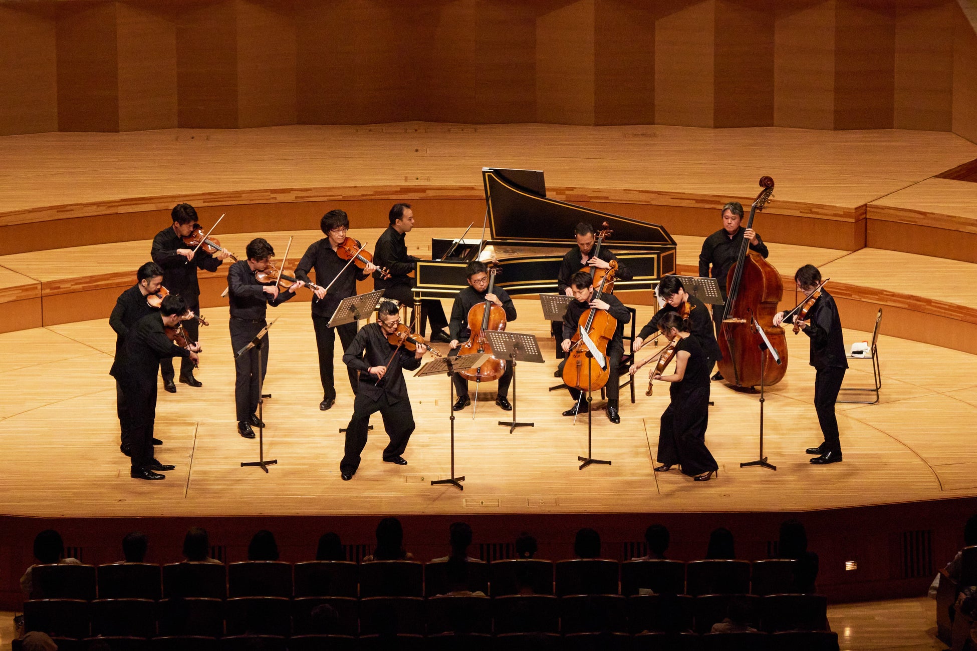言うまでもなく、サントリーホールは日本におけるクラシック音楽のメッカ。2000を越える客席、巨大なパイプオルガンを背にフルオーケストラがセッティングできる大きなステージを有し、国際的にもサントリーホールでの来日公演というのは確かなステータスとなる。組長以下13名の弦楽器奏者にチェンバロを加えたセッティングは舞台面積に対してこじんまりと見えるが、限られた演奏家だけが纏う風格をもって彼らはステージに現れた。石田泰尚と石田組にはサントリーホールがよく似合う。