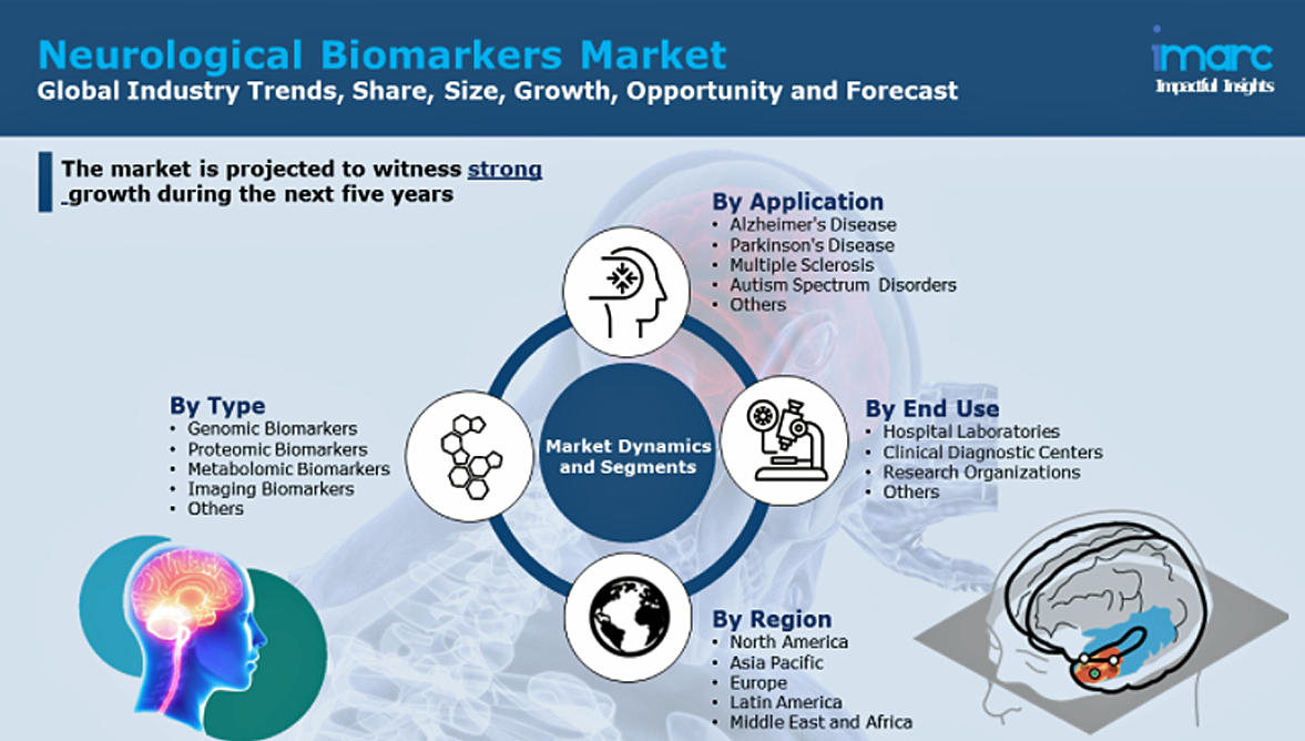 脳卒中、運動ニューロン疾患(MND)、アルツハイマー病(AD)、パーキンソン病(PD)、ハンチントン病(HD)などの神経疾患の発生が増加しており、より迅速な薬剤開発が求められています。これは、バイオマーカーが新薬や治療戦略の効果を測定するのに役立つことから、市場の成長を促進する主な要因の一つとなっています。また、低侵襲手術や個別化医療の導入が進んでいることも、市場の成長を促す大きな要因となっています。また、様々な神経疾患には共通の特徴があるため、特定の疾患やそのサブタイプを区別するための複数のバイオマーカーに対する需要が高まっています。さらに、質量分析装置やイメージング技術の進歩により、大量の生化学マーカーや脳の構造変化を迅速に評価できるようになりました。このことは、デジタルバイオマーカーの導入や臨床試験の増加とともに、今後数年間の市場の成長を促進するものと予想されます。