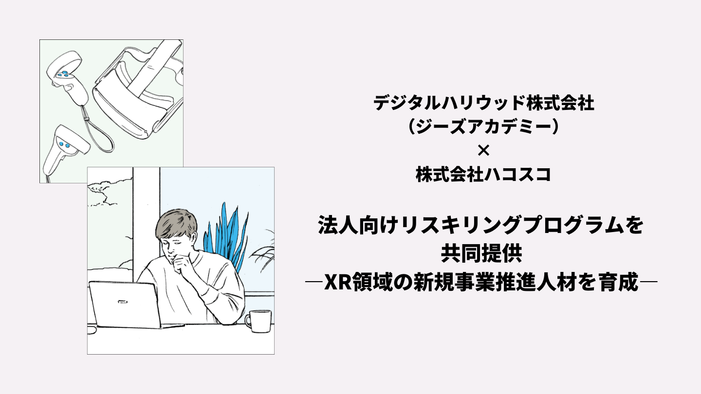 今回、ジーズアカデミーと株式会社ハコスコがそれぞれの強みを活かしコラボレーションし、XR領域での新規事業推進人材育成のリスキリングプログラムを共同開発。本プログラムの提供を2024年2月より開始するため、業務提携を締結する運びとなりました。