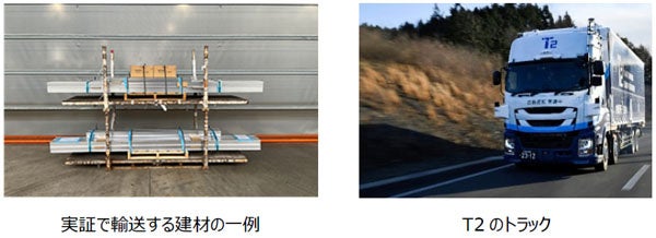 そのため、今回の実証実験では、自動運転トラックによる輸送において、荷姿や重量が不均一な建材の積合せ輸送における輸送品質の検証に加えて、貨物を積載した状態での幹線輸送における自動運転の走行ルートやリードタイムの確認を行います。