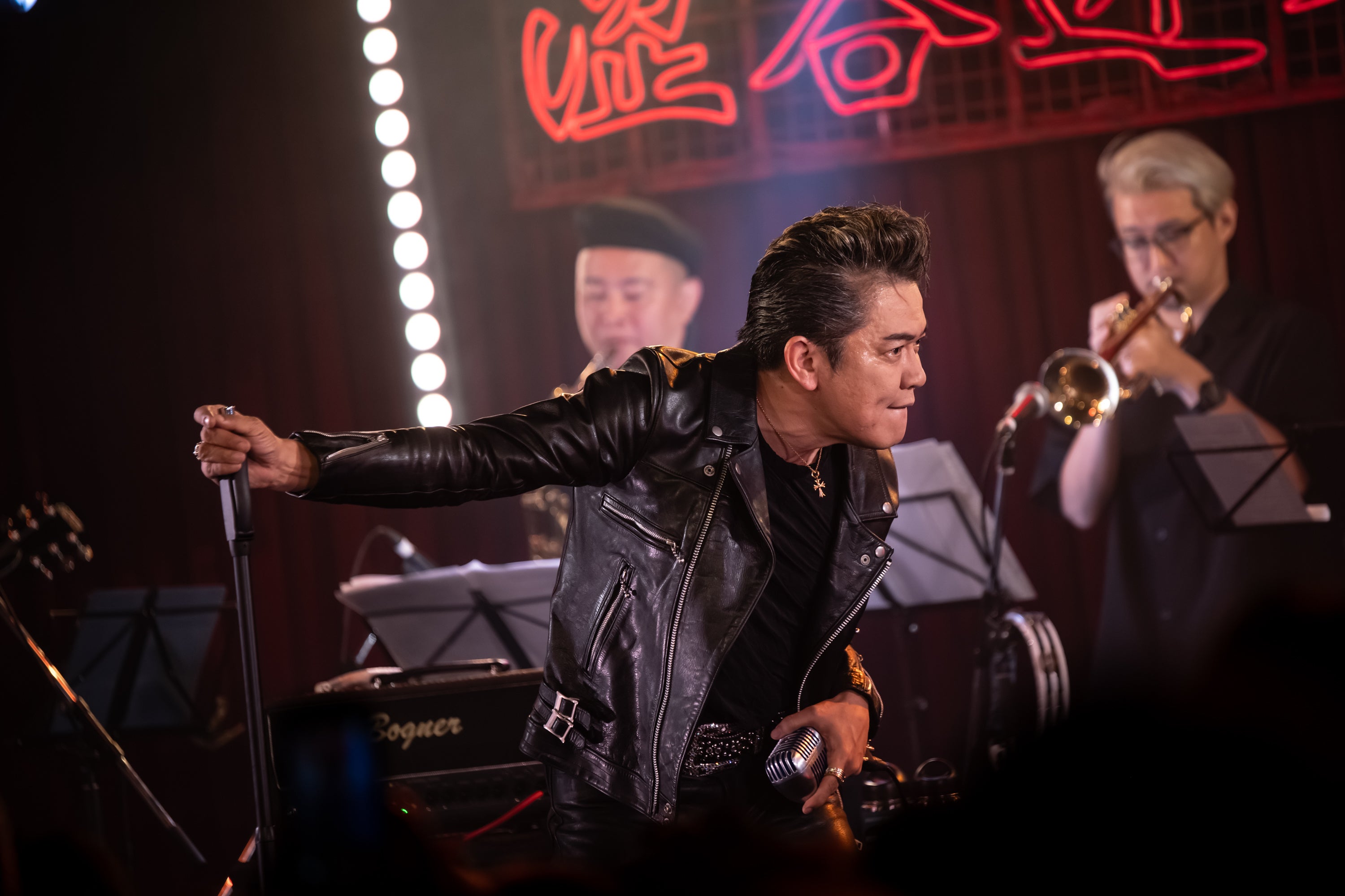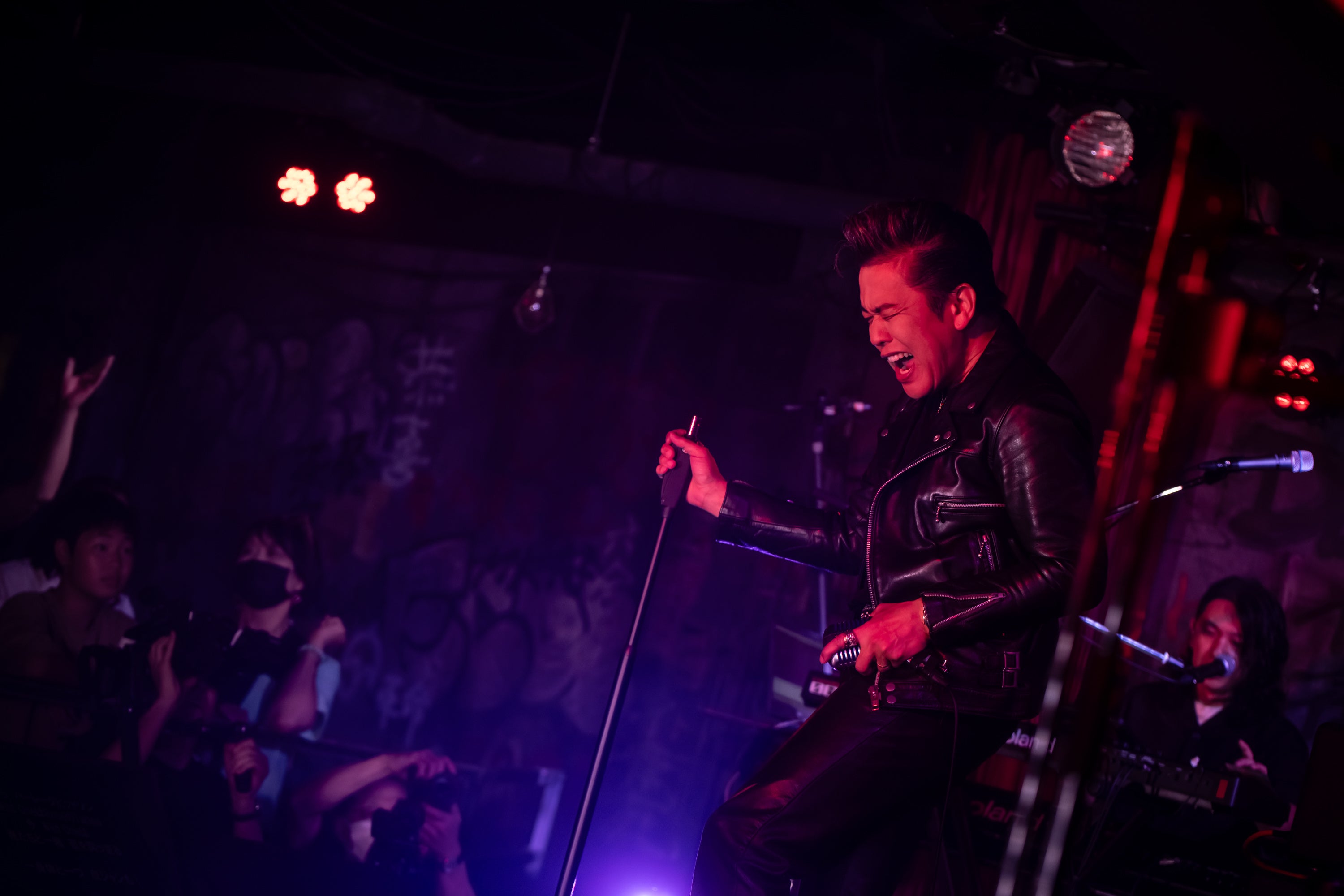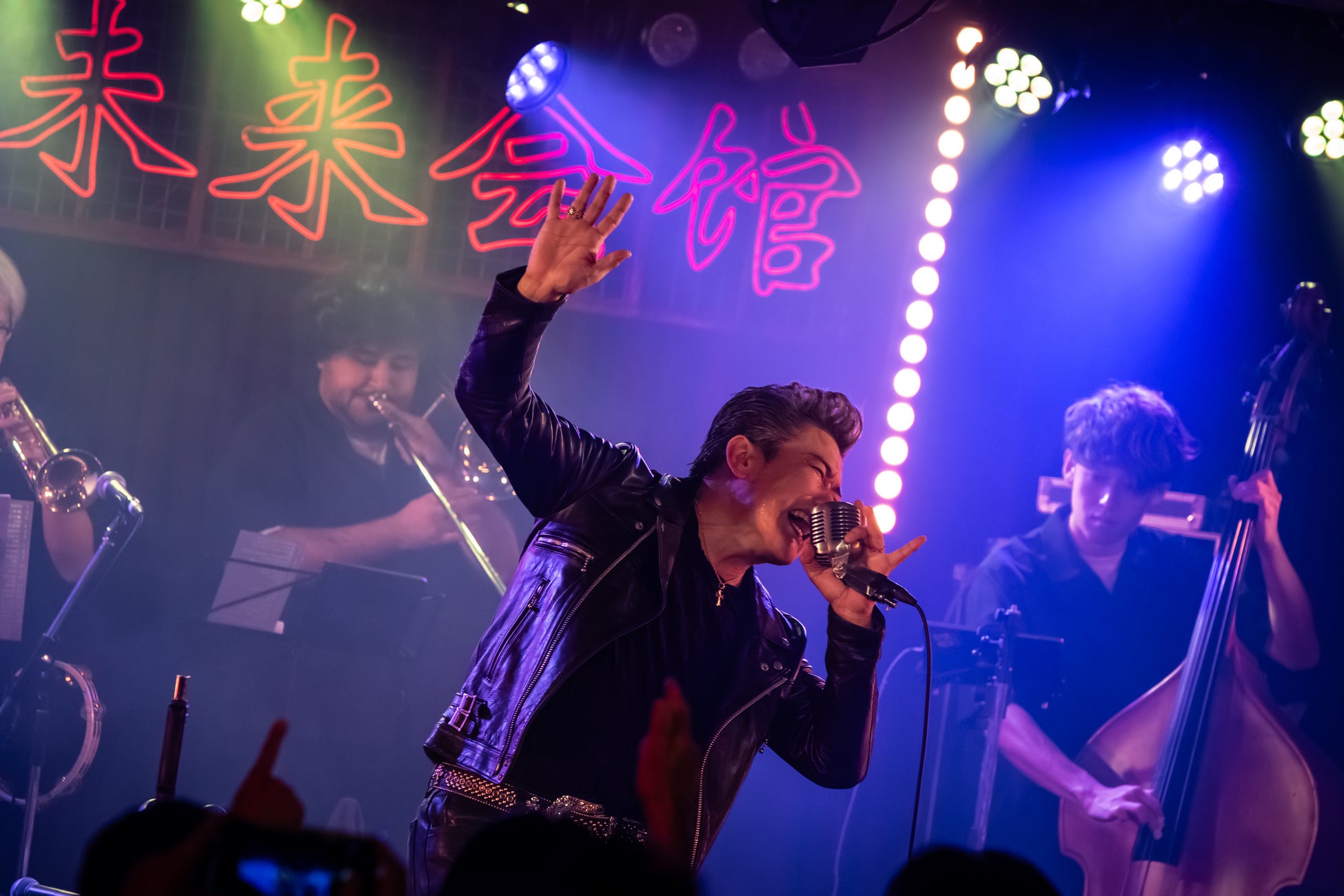 いかした革ジャン、リーゼント、銀のバックルにエンジニアブーツ。「行くぞ!」と一声吼えると、ガイコツマイクをひっつかみ、1曲目「ロカビリーカーニバル」からぶっ飛ばす上澤津。フロアを埋めたオーディエンスに笑いかけ、拳を振り上げ、「東京バーニングタウン」「傷だらけのパラダイス」とアップテンポのMAGICナンバーを畳みかける。ホーン隊を含む7人のバンドメンバーは凄腕揃いで、疾走感とスウィング感を兼ね備えたご機嫌なサウンドで後ろからガンガン煽る。