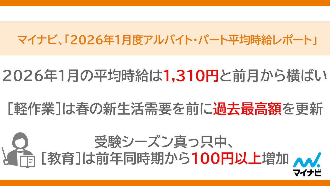 2026年1月の平均時給は1,310円と前月から横ばい。[軽作業]は春の新生活需要を前に過去最高額を更新。受験シーズン真っ只中、[教育]は前年同時期から100円以上増加