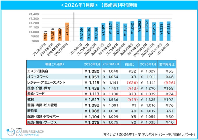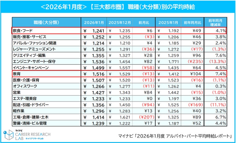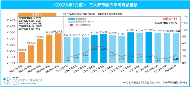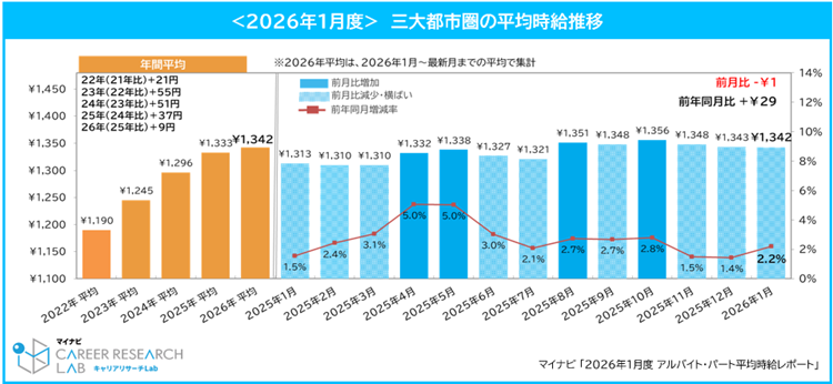 株式会社マイナビ(本社:東京都千代田区、代表取締役 社長執行役員:粟井俊介)は、「2026年1月度アルバイト平均時給レポート」を発表しました。本調査は、アルバイト・パート求人情報サイト『マイナビバイト』(https://baito.mynavi.jp/)に掲載された求人広告データを集計したものです。