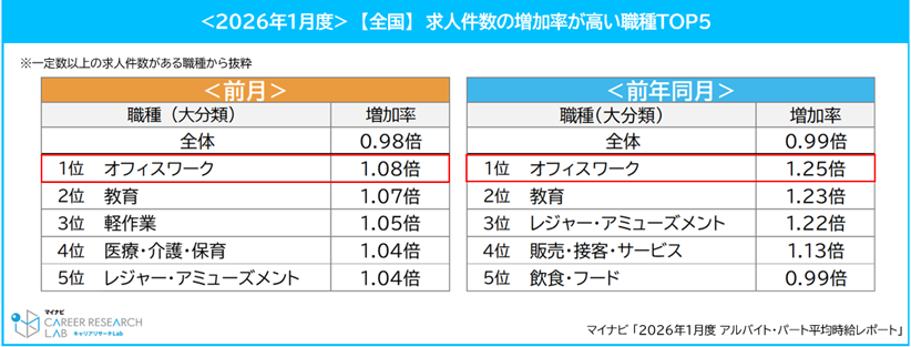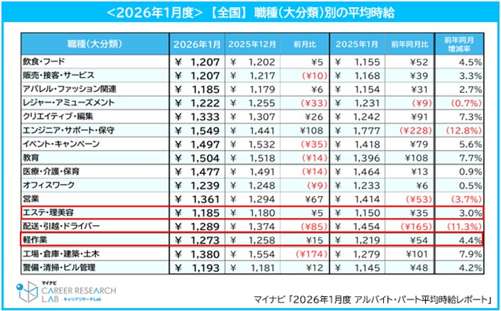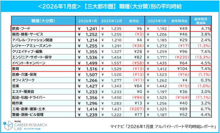 マイナビ、「2026年1月度アルバイト・パート平均時給レポート」を発表