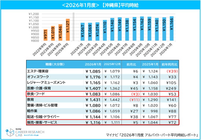 また、「沖縄県」の1月の平均時給は1,166円(前月比:16円増、前年同月比:99円増)だった。