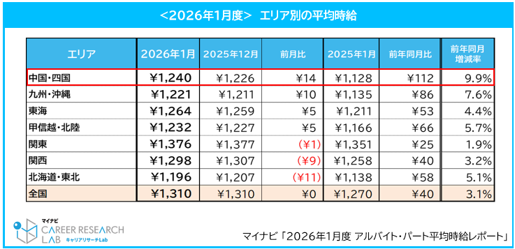 エリア別平均時給では、「中国・四国」が1,240円となり、前月(1,226円)から14円増加し、もっとも増加額が多かった。次いで増加額が多かったのは「九州・沖縄(1,221円)」で、前月(1,211円)から10円増加した。