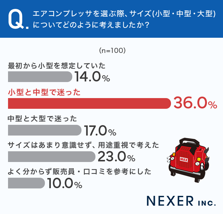 今回の調査では、エアコンプレッサを購入した大工さんの36.0%が「小型と中型で迷った」と回答し、サイズ選びが多くの方にとって悩みどころであることがわかりました。
