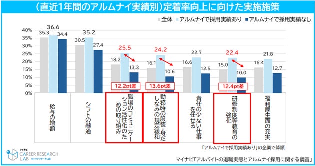 アルムナイ採用の実績がある企業では、採用実績がない企業と比較して、「勤務時の服装・身だしなみの規定緩和」(13.6pt差)、「研修制度等教育の強化」(12.4pt差)、「職場のコミュニケーション活性化のための取り組み」(12.2pt差)の実施率が高かった。給与やシフトといった労働条件面での工夫に加え、こうした働きやすさや個人の成長を促進する取り組みは、一度は退職して他社で働いた経験がある元アルバイト就業者に、再び働きたいという意識を高める効果があると考えられる。【図4、5、6、7】