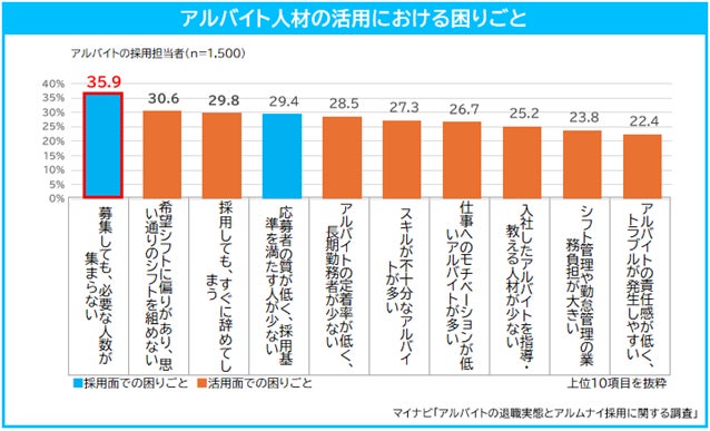 企業の採用担当者に、アルバイト人材の募集や活用における困りごとを聞いたところ、「募集しても、必要な人数が集まらない」が35.9%で最も高く、定着だけでなく、新規採用に関しても難しい状況が続いており、企業が試行錯誤する動きがみられている。