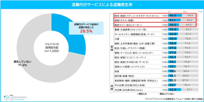 ◆退職代行でアルバイト従業員が退職した企業は28.5%。業種別では、[販売・接客(パチンコ・カラオケ・ネットカフェ)]が最も多く46.0%の発生率