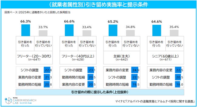 2025年にアルバイト退職者がいた企業に引き留めの有無を聞くと、「フリーター(40代以上)」に対して66.6%の企業が引き留めを行ったと回答した。引き留めの際に提示した条件は、「シフトの調整」(23.1%)、「勤務時間の短縮」(20.5%)、「業務内容の変更」(20.5%)が上位となり、柔軟に働ける条件提示を通じて退職の回避を図る企業の姿勢がうかがえる。