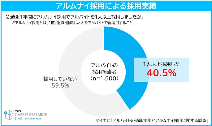 さらに、新規採用に苦戦する中、人手不足解消のための施策として直近1年以内に、アルムナイ採用※で、アルバイトを再雇用した実績が「1人以上ある」企業の割合は40.5%にのぼった。