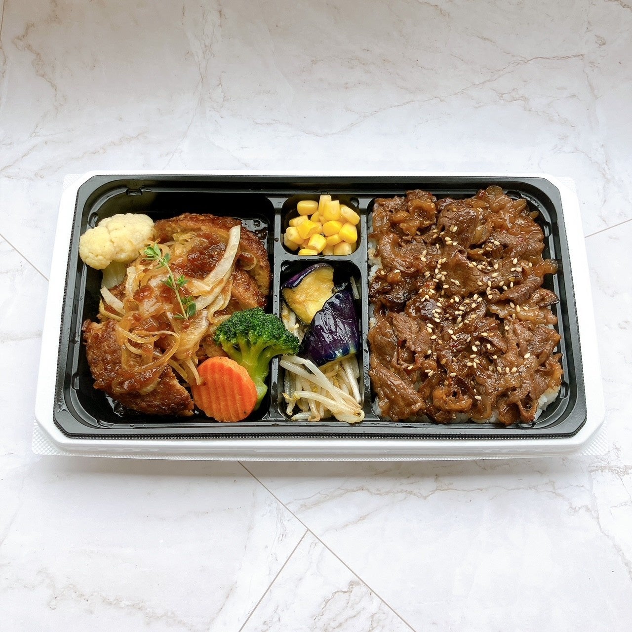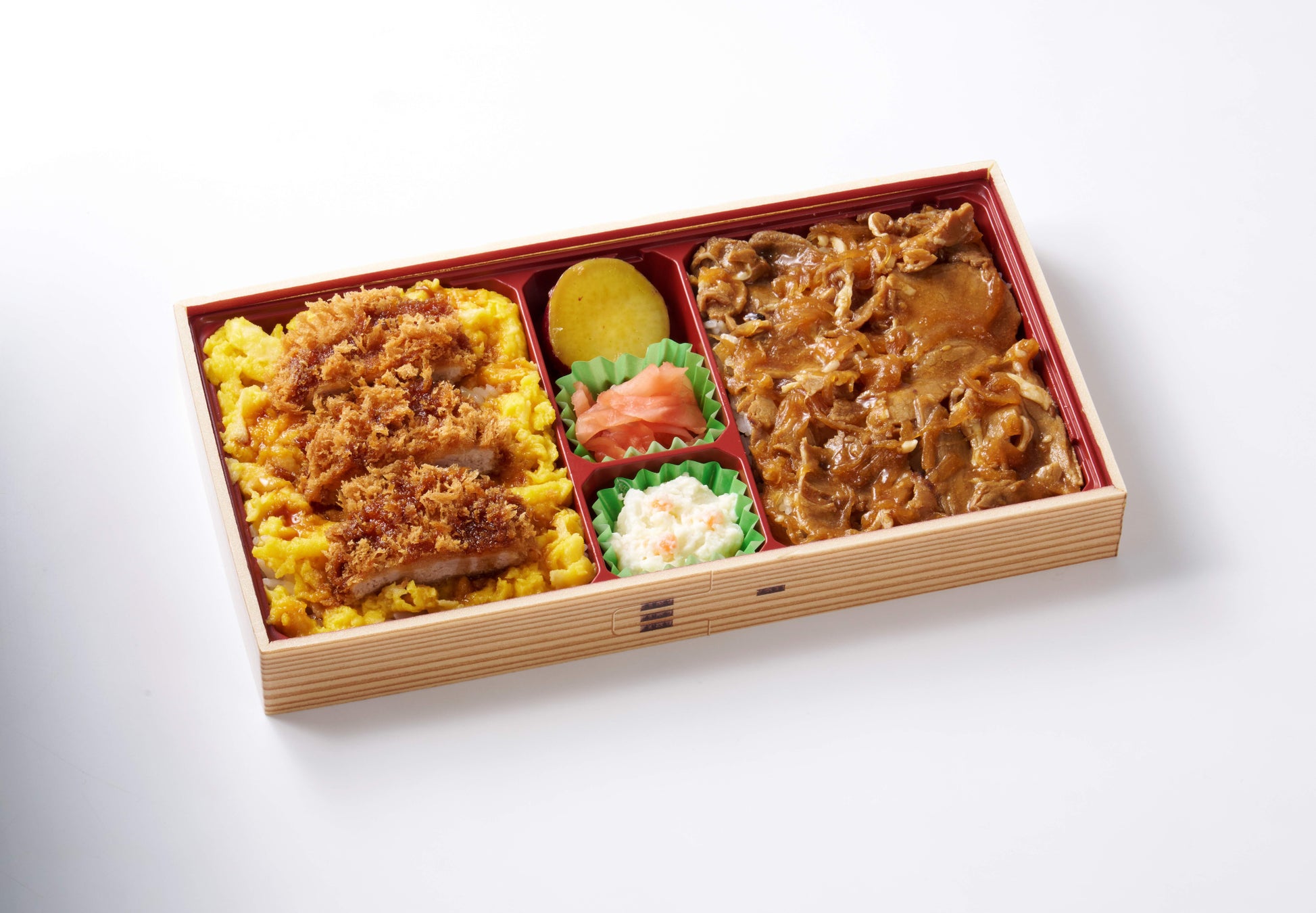豚焼肉とたれかつ丼の2種類が楽しめるボリューム弁当。がっつり食べたい方やシェアして食べたい方におすすめ。