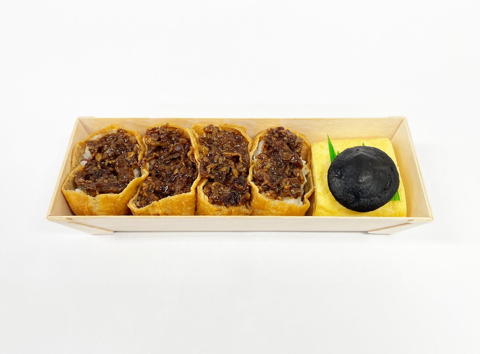 お肉をたっぷり味わえる牛肉いなり、だし巻き、煮付椎茸が入った弁当。