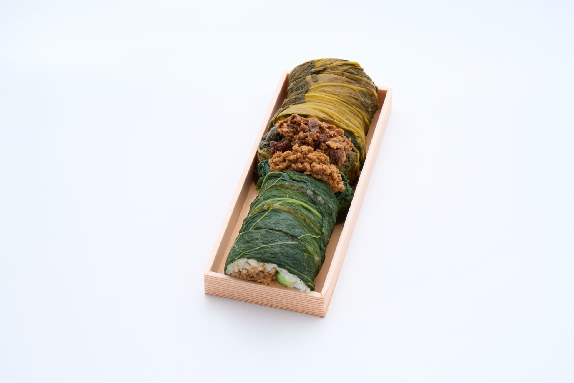 旨味たっぷりでしっかりとした味わいの柔らか牛肉煮と鶏そぼろを海苔と高菜の二重巻きにし、レモンマヨで爽やかでまろやかに仕上げました。高菜は新高菜漬けと古高菜漬けの2種類をたのしめます。