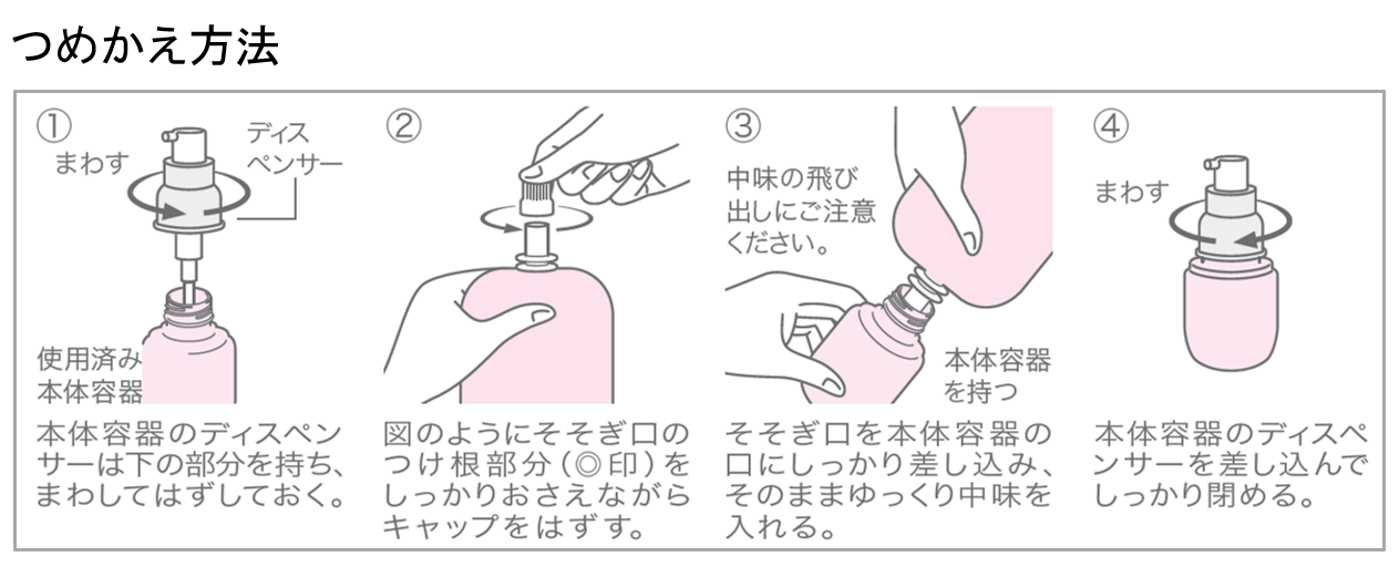 ●朝・夜、化粧水の後、手のひらにディスペンサー1回押し分をとり、顔の中心から外側に向かって、すみずみまでやさしくなじませます。