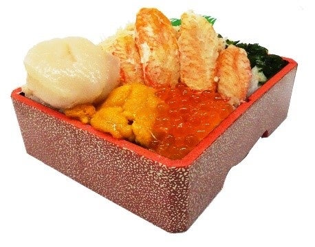生うにを和えた毛ガニのむき身をはじめ、ほたて、サーモン、いくら、中トロののったインパクト抜群な弁当です。