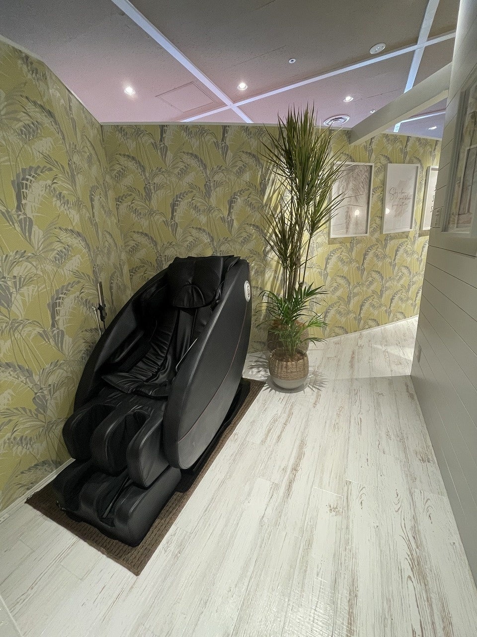 休憩スペースに直結する形で、リゾートテイストの男女別のパウダールーム&マッサージチェアスペースも併せてプロデュースしました。