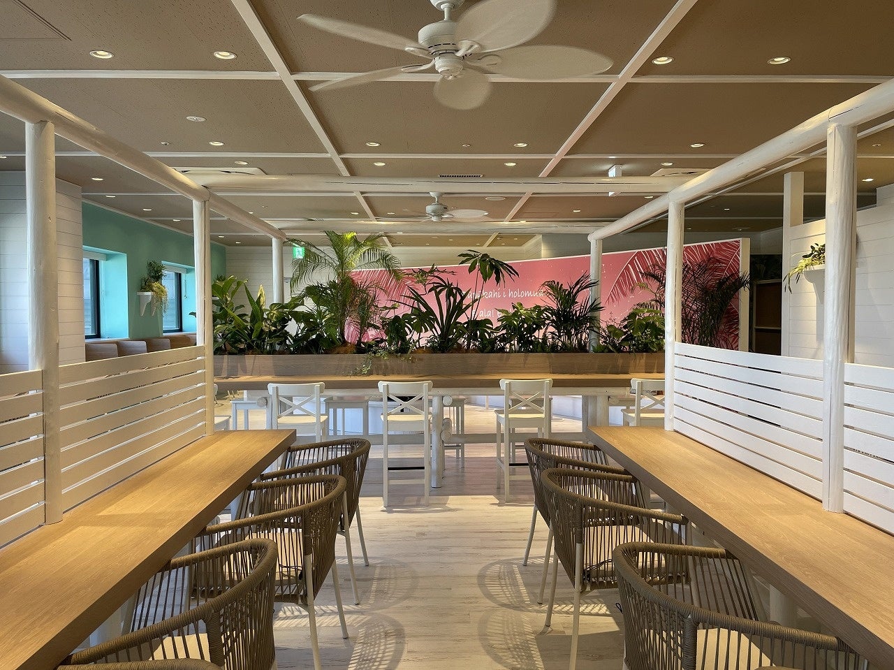 “東北のハワイ“と呼ばれるいわき市をイメージし、カラフルで元気さと親しみのあるハワイアンテイストを表現しつつ、休憩時間をリラックスして過ごせるよう自然光を取り入れた温もり溢れるデザインに仕上げました。
