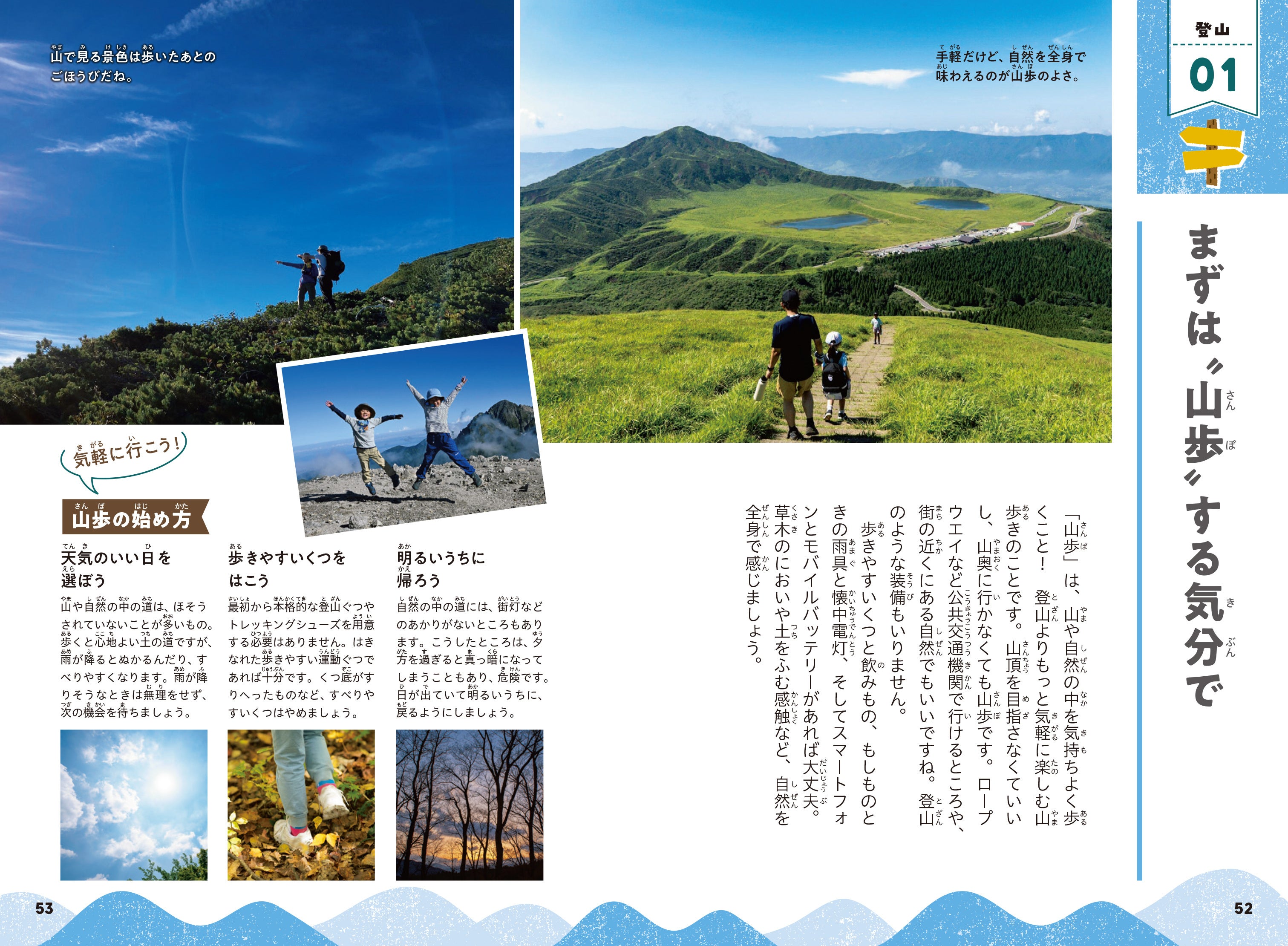 山頂で出会う素敵な景色、体を動かす爽快感、森で会う鳥や虫たち、川のせせらぎ……。日常をはなれて味わう素敵な体験を、たくさんの写真とわかりやすいイラストで伝えます。山に行ったことがない人も、きっと自分の目で見たくなる写真の数々です。