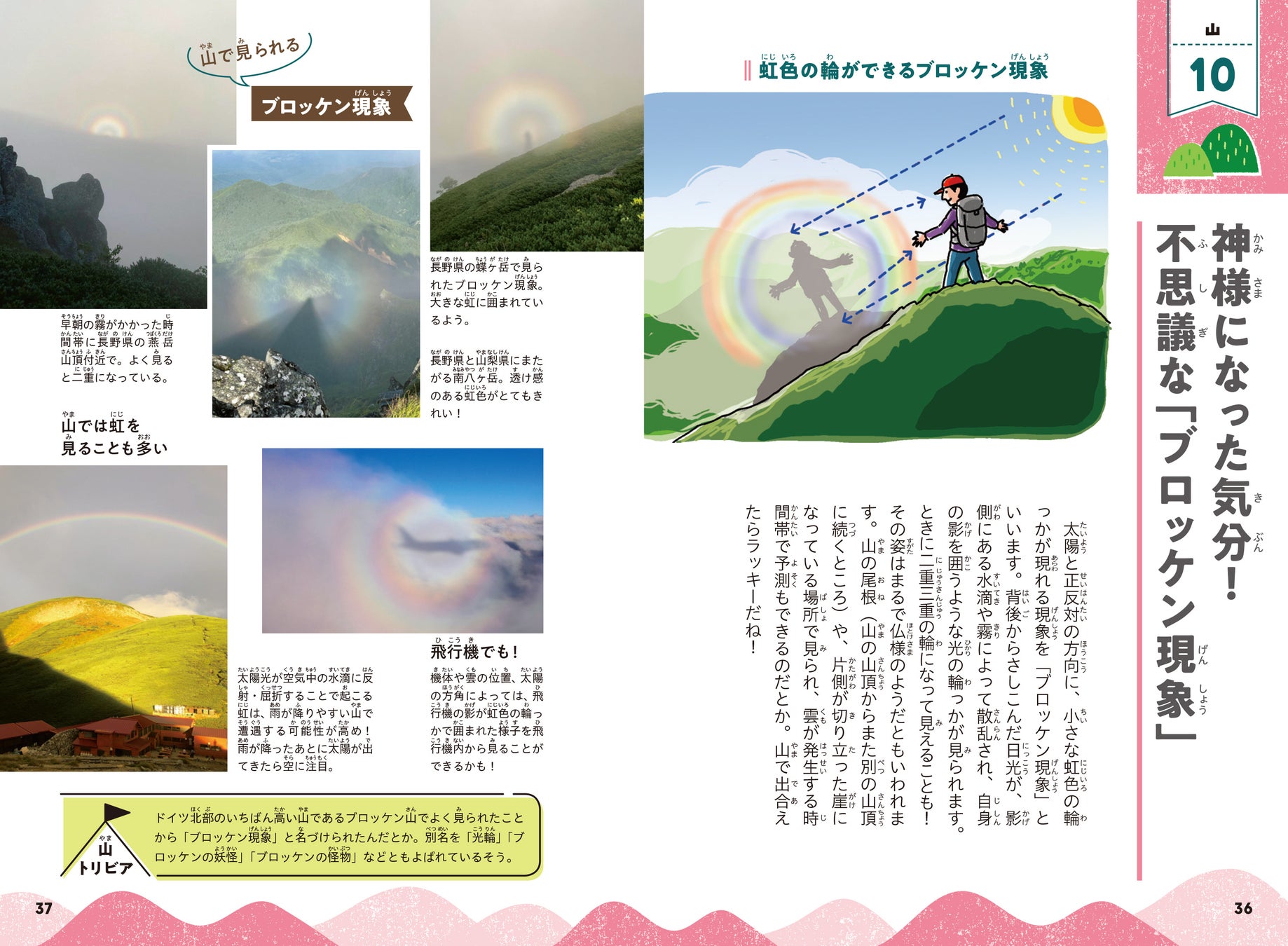 虹に囲まれたような不思議な「ブロッケン現象」。こんな神秘的な景色が見られるのも、山の楽しみのひとつ。なぜブロッケン現象が起こるのでしょう? 「ブロッケン現象」の名前の由来はなに? 「自然現象」「地学」「環境問題」「物理」「天体」「天気」の知識まで、楽しみながら自然の知識を学ぶことができます。