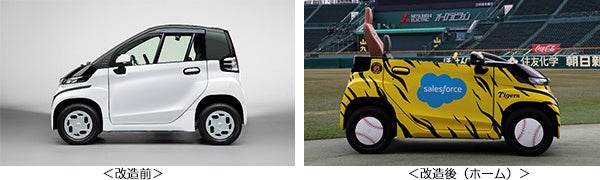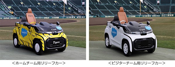 このリリーフカーは、トヨタ自動車株式会社のご協力により、同社の超小型BEV(バッテリー式電気自動車)の「C+pod(シーポッド)」をベースとして、身体の大きな投手でもゆったりと乗車できるよう助手席の位置を後方へ移動させる等の改造に加え、助手席シートをグローブがモチーフのデザインに変更するなど、観戦するファンがより楽しめるとともに、投手の士気を高めるような工夫が随所に施されたオリジナル仕様です。また、ホーム用の車体は虎柄にラッピングされ、豊田合成株式会社による特製のイエローステアリングも、デザインのポイントとなっています。