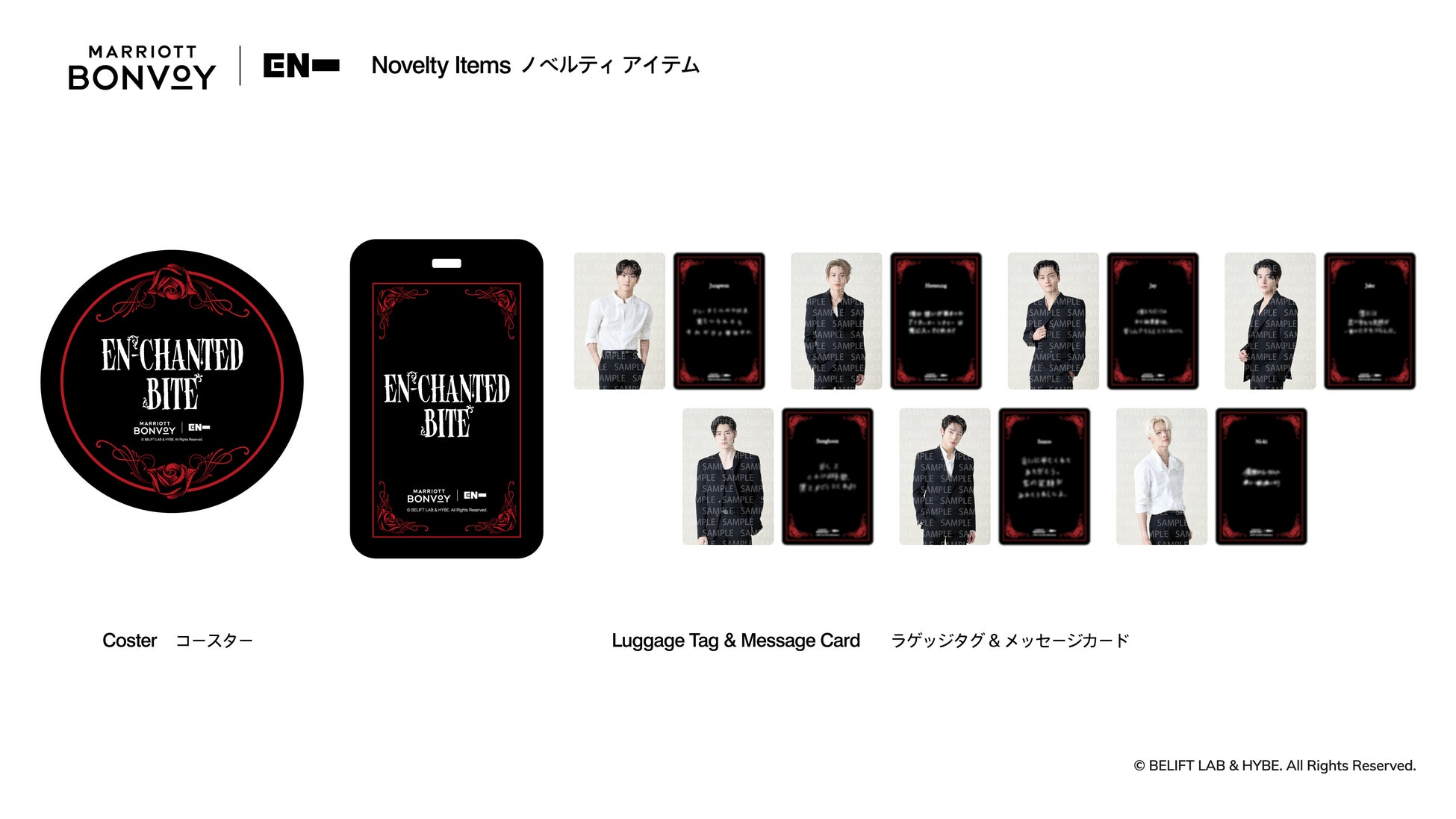 また、期間中にアフタヌーンティーをお楽しみいただいたお客様には、1食につき1セット、特典としてコースターと、ENHYPENメンバー7名からのオリジナルメッセージカード付きラゲージタグをご用意いたします。