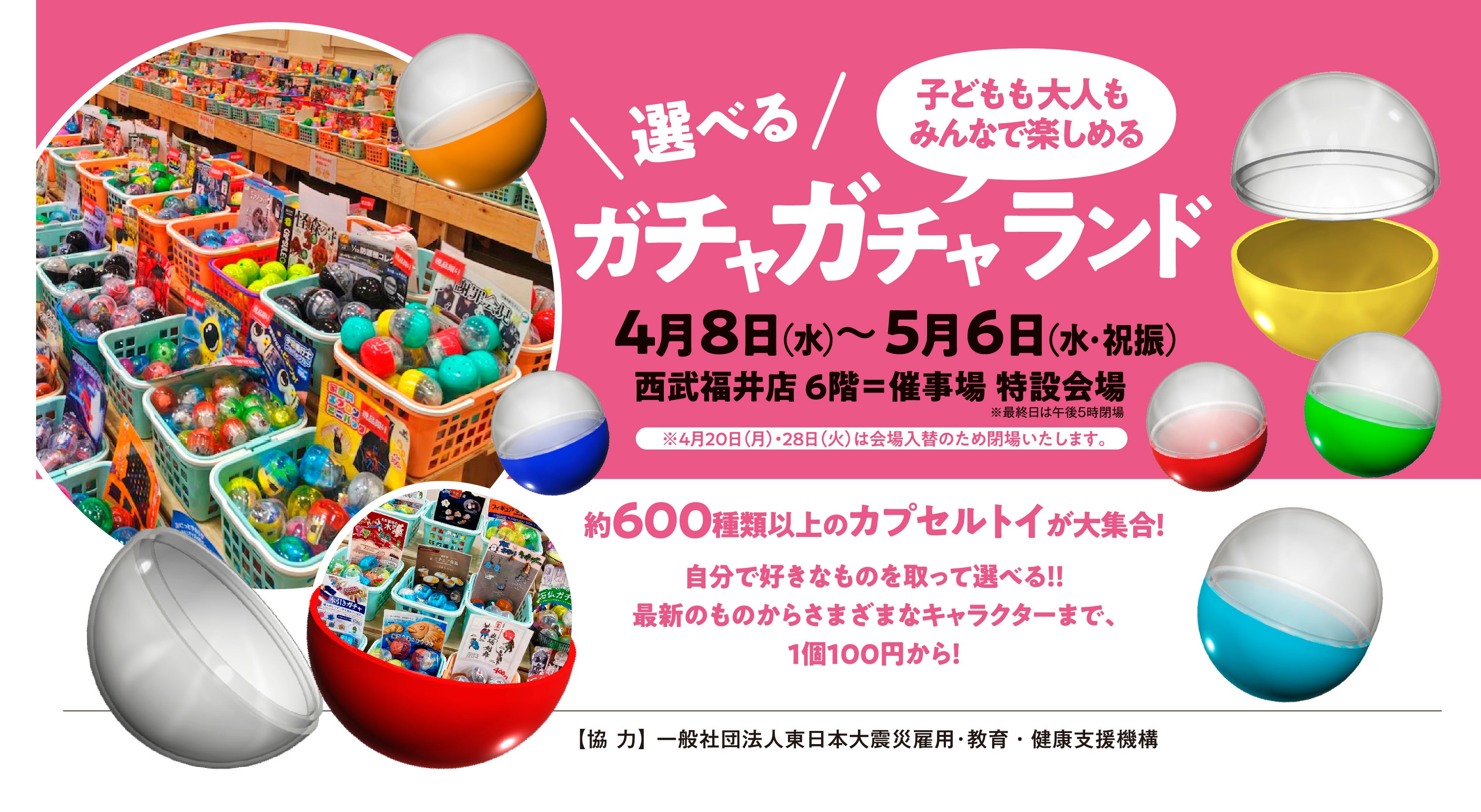 西武福井店では、〈選べるガチャガチャランド〉を初開催いたします。今、こどもからおとなまで幅広い世代に大人気のガチャ。種類も豊富で人気のキャラクターや食べ物のミニチュアなどかわいく、揃えたくなるアイテムが大集合します。