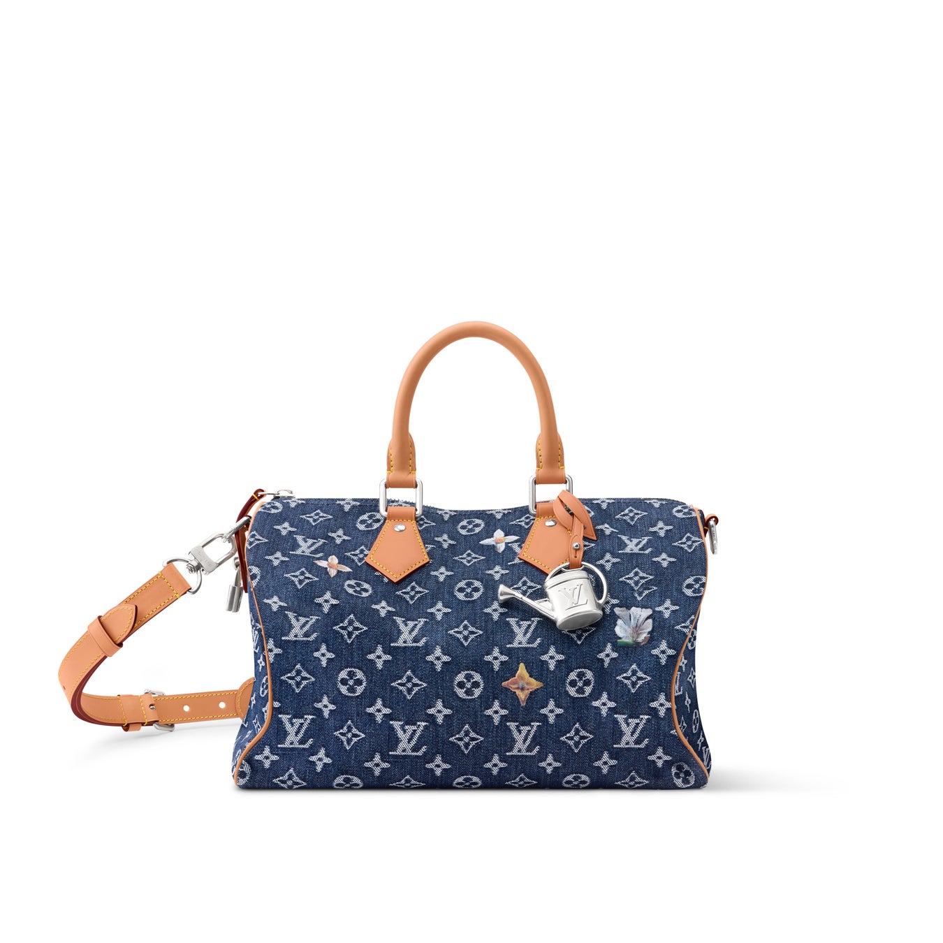 モノグラム·フラワー デニムに、レザーのトリミングとトップハンドルでアクセントを添えた「スピーディ·バンドリエール 30」。ジョウロのチャームが夏らしい雰囲気を引き立てます。エクリュカラーのテキスタイルライニングが施された内装には、2つのフラットポケットが付属しています。